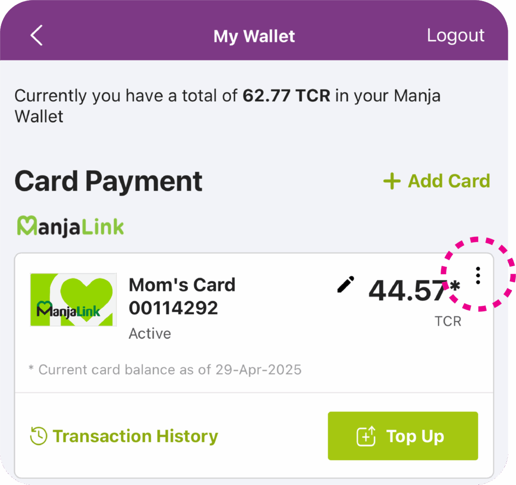 Step 1: On your Card Payment page (via LUGO or the ManjaLink website), click the three-dot icon at the top right corner of the card you wish to unlink.