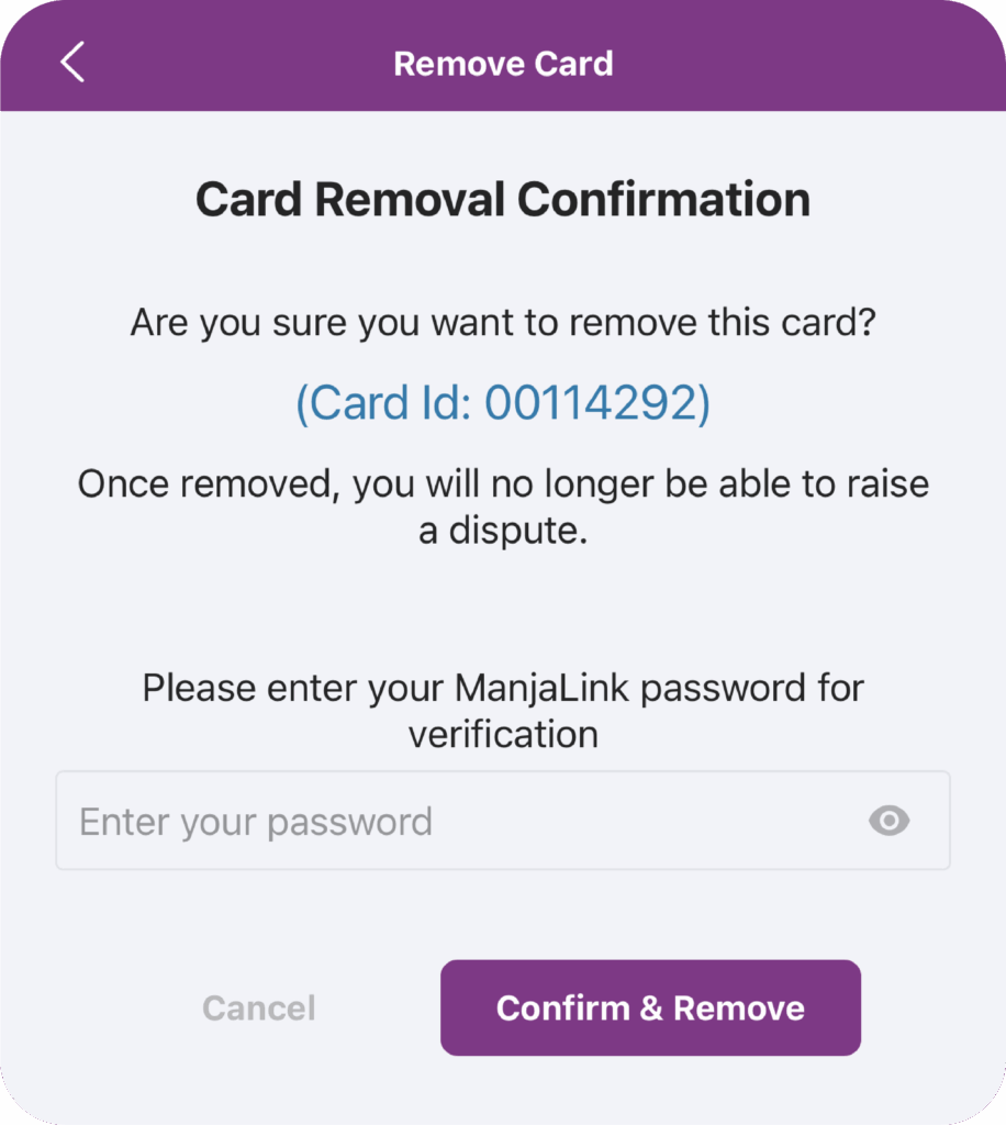 Step 3: Key in your ManjaLink’s account password and select “Confirm & Remove”