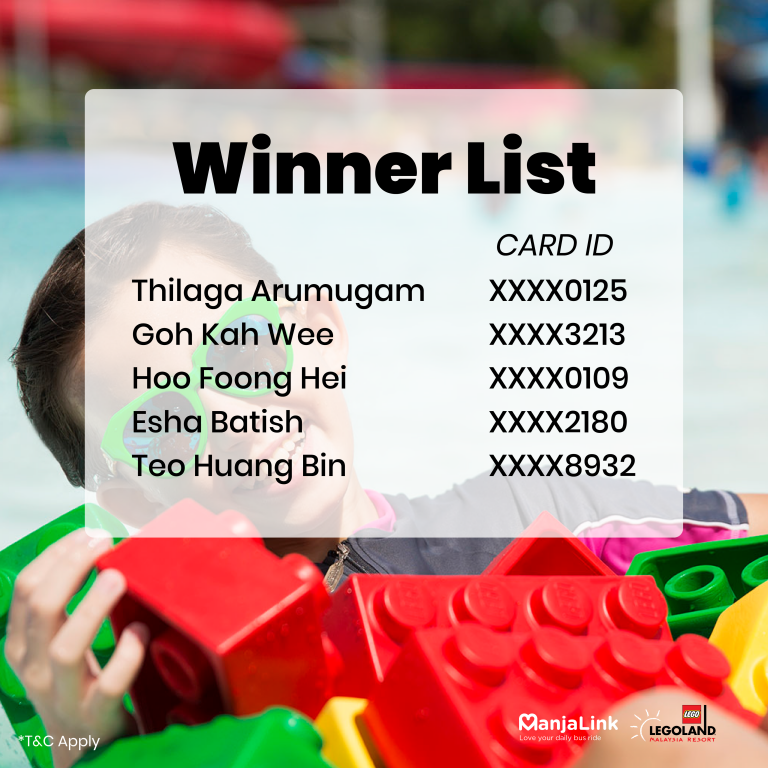 ? Win a Pair of LEGOLAND® Theme Park Tickets Worth RM798! ? Top up your ManjaLink card via the LUGO app and stand a chance to win an unforgettable adventure! ? Campaign Period: 23 Jan – 22 Feb 2025? Prize Details: LEGOLAND® Combo Ticket (Theme Park + SEA LIFE + Water Park) worth RM399 each How to Join:1. Top up RM300 to your ManjaLink card via the LUGO app.2. Each RM300 top-up earns you 1 chance to win.3. The more you top up, the higher your chances! ? Winners Announced: 24 Feb 2025 Don’t miss out on this exciting opportunity to create lasting memories at LEGOLAND®. Start topping up today and let the adventure begin! ?Download the LUGO app now and top up to win! TERMS AND CONDITIONS The mechanics as well as the conditions stated below shall govern the Unlock LEGOLAND Adventure with a RM300 ManjaLink Top-Up! in the website organized by ManjaLink. By participating in this campaign, customers shall be deemed to have understood and agreed to be bound by the Terms and Conditions of this campaign. TERMS CONDITIONS 1. Eligibility 1.1 This promotion is open to all customers who purchase a ManjaLink card via the Causeway Link Holidays dedicated promotion webpage between 23 January 2025 and 22 February 2025. 1.2 The promotion is valid for all ManjaLink customers who meet the purchase requirements outlined below. 2. Promotion Mechanics 2.1 Customers must top up a minimum of RM300 on their ManjaLink card through the LUGO app during the campaign period to qualify. 2.2 Each RM300 top-up grants one entry into the lucky draw. Multiple RM300 top-ups increase the chances of winning. 2.3 At the end of the campaign period, a total of 5 winners will be randomly selected. Each winner will receive a set of 2 tickets: one for LEGOLAND, which includes access to the Theme Park, Sea Life, and Water Park. 2.4 Tickets are non-transferable, non-refundable, and cannot be exchanged for cash. 2.5 Ticket holders must comply with LEGOLAND Malaysia’s terms and conditions. 3. Acceptance of Terms & Conditions 3.1 By participating in this promotion, customers agree to abide by all the terms and conditions specified herein. 3.2 The decision of the Organizer (ManjaLink) in all matters relating to this promotion shall be final and binding on all participants. 4. Non-Compliance 4.1 Failure to comply with any of the terms and conditions during the campaign period may result in the participant’s disqualification. 5. Usage of Customer Information 5.1 By participating in this promotion, customers grant the Organizer the right to use their name, photos, and likeness from social media platforms for promotional and advertising purposes, without any compensation, unless prohibited by law. 6. Release of Liability 6.1 By participating in this promotion, customers and their respective parents or legal guardians agree to release, discharge, and hold harmless the Organizer, its subsidiaries, affiliates, directors, officers, employees, and agents from all liabilities, costs, injuries, loss, or damages of any kind arising from or in connection with the promotion. 7. Intellectual Property 7.1 All materials, including photos, artworks, and other content used in connection with this promotion, shall become the sole property of ManjaLink. 8. Communication by Organizer 8.1 The Organizer reserves the right to send SMS messages, email notifications, or make phone calls to customers (and their legal guardians) containing information regarding the promotion’s mechanics, as well as announcements related to the campaign. 9. Invalidity of Terms 9.1 If any provision of these Terms & Conditions is found to be invalid, illegal, or unenforceable, the remaining provisions shall remain in full force and effect. 10. Modification of Terms & Conditions 10.1 The Organizer reserves the right to amend, modify, delete, or add to these Terms & Conditions, including the promotion’s mechanics, at its sole discretion, at any time during the promotion period. 11. General Terms 11.1 This promotion is subject to availability. 11.2 The Organizer reserves the right to disqualify any participant found to be violating the Terms & Conditions. 11.3 By participating, all customers acknowledge that they have read, understood, and agreed to the Terms & Conditions outlined above.